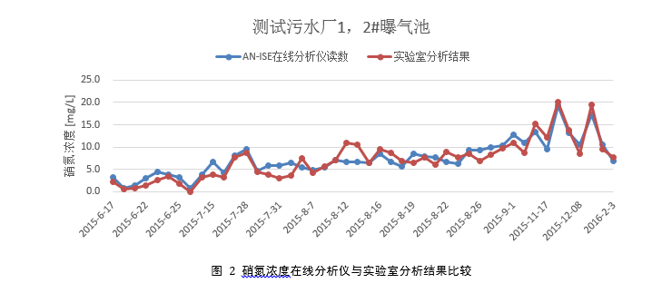 由于在線分析方法(電化學(xué)法)與實驗室分析方法(分光光度法)二者在原理上的差異,所以其二者的測量值無法完全比對上。但是二者所反映的趨勢項目,數(shù)值偏差不大。所以在進行測試的兩個污水廠中,客戶均表示相同的觀點:AN-ISE分析儀的測量結(jié)果已經(jīng)能夠反映曝氣池中氨氮及硝氮的濃度變化,完全能夠滿足客戶過程控制上的需求。