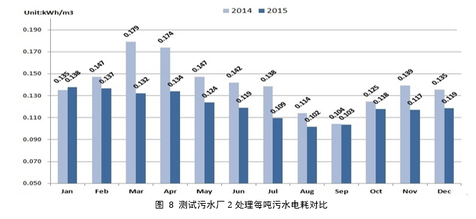 圖 8為測試污水廠2 2014年與2015年處理每噸廢水所需要的電耗對比,在引入精確曝氣系統(tǒng)之后,單位電耗有了明顯降低,從2014年的0.140kWh/m3下降至從2015年的0.121kWh/m3,單位能耗下降13.5%,節(jié)能效果顯著。以一個日處理量為10萬噸的污水廠為例,利用AN-ISE在線分析儀的測量值來對風(fēng)量進行精確控制,處理每噸污水節(jié)約電耗0.02kWh,電費以0.7元/kWh計,每年僅在風(fēng)機降耗上就能夠節(jié)約電費約為51萬元。
