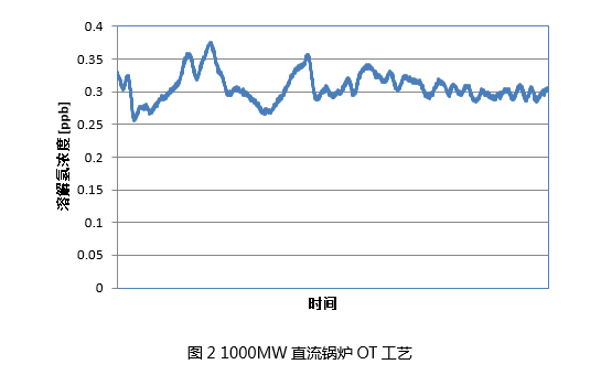 我們分別對600MW AVT和1000MW機組OT工藝過熱蒸汽出口溶解氫測試,得到的溶解氫數(shù)據(jù)圖1、圖2所示。由圖1可知,機組在啟動初期,由于熱力設(shè)備表面沒有形成致密的氧化膜,所以溶解氫的含量非常大,一旦機組運行正常,溶解氧含量逐漸降低,溶解氫也隨之降低并維持在2ppb以內(nèi)。由圖2可知,在1000 MW機組穩(wěn)定期間,由于OT工藝形成了致密的氧化膜,所以溶解氫的含量趨于穩(wěn)定0.3 ppb左右。而Orbisphere 3655以及510系列溶解氫分析儀具有最低檢出限低(0.03 ppb),以及護圈和底座技術(shù)來保證零點不發(fā)生漂移,能夠很好的滿足客戶對溶解氫的測量需求。